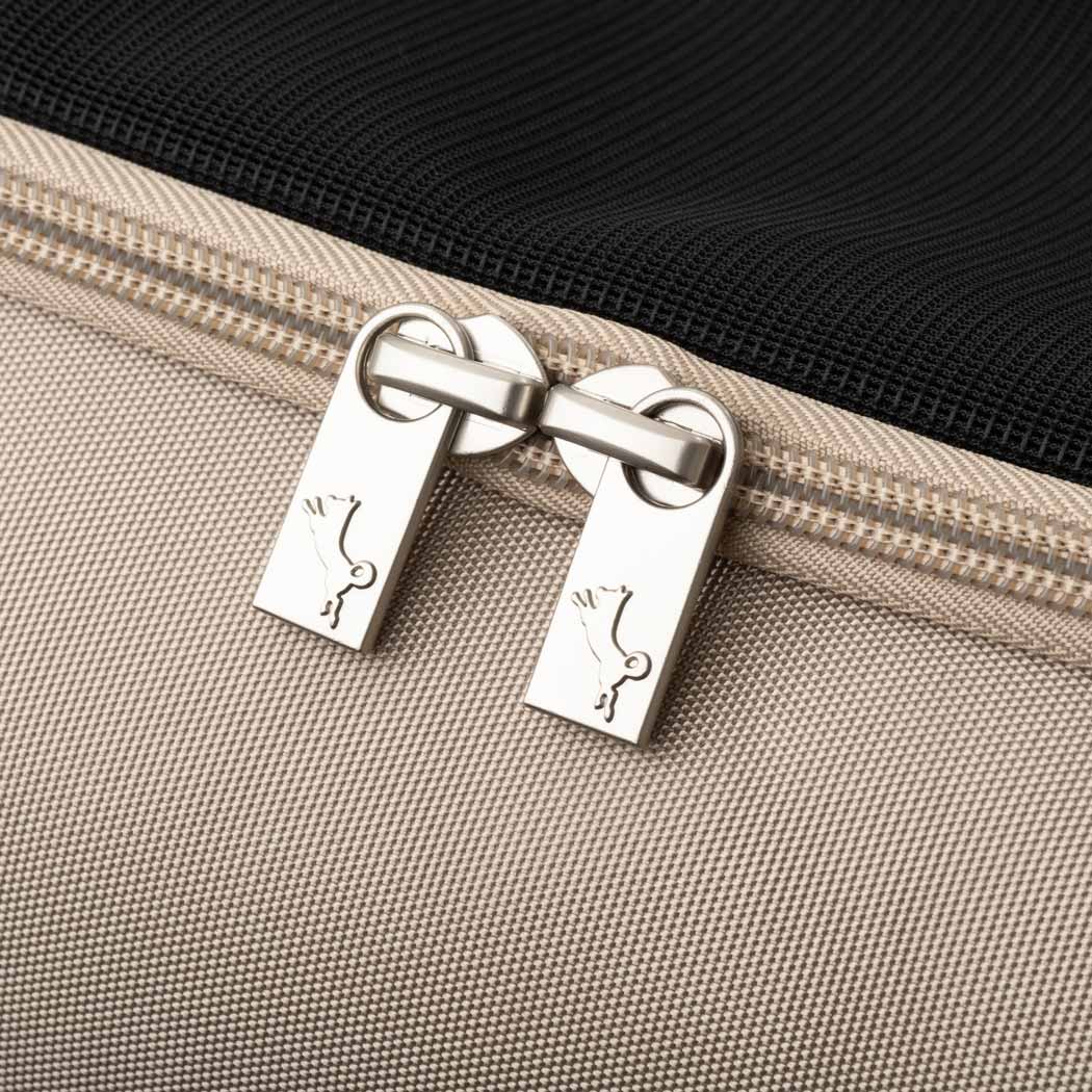 引手を引かないと内側から開かない安全ロックファスナーを採用。また、メッシュ部分は破れにくい丈夫な二重構造になっています。