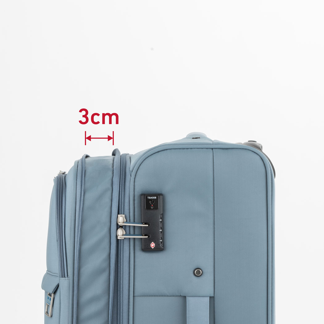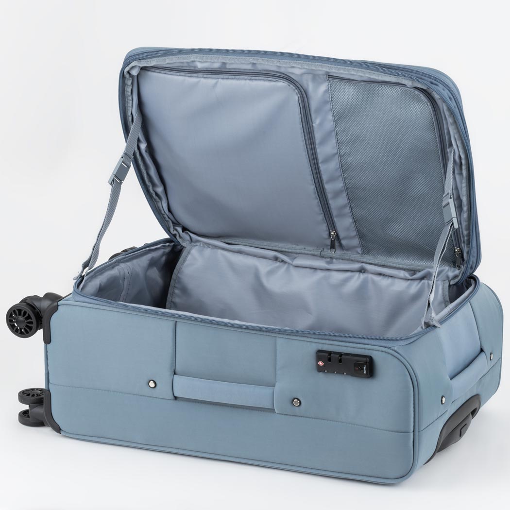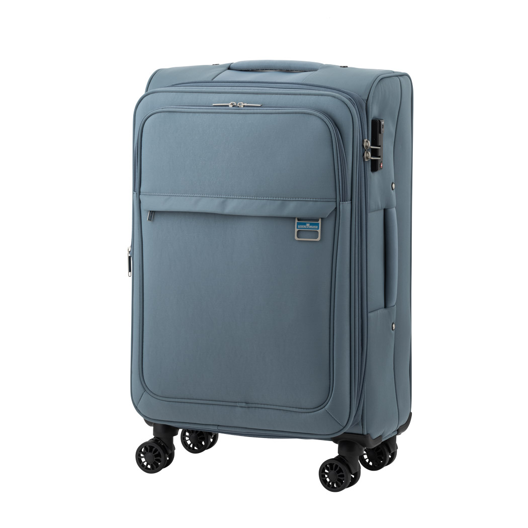 旅先で荷物が増えても安心な容量拡張機能を搭載。不正なこじ開けを防ぐ防犯ファスナーや静音で滑らかな走行を可能にするクッション付きダブルキャスターなど機能が充実。